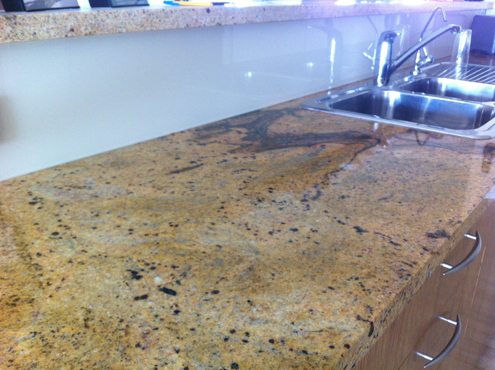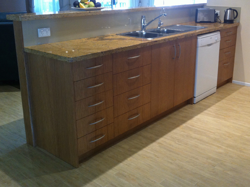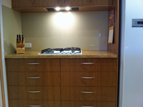 Kitchen made from American Oak rift cut veneer. The veener cut was selected for it's uniform grain pattern. The granite benchtops give a very personal feel to this kitchen and the piece of stone was specifically selected. The kitchen also incorporates a concealed rangehood and glass splashbacks with a pearlescent finish. The veneer has been finished in a custom stain and 30% 2 pack satin lacquer.