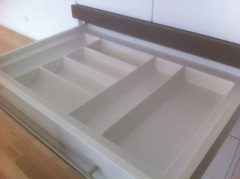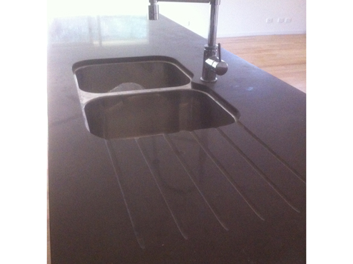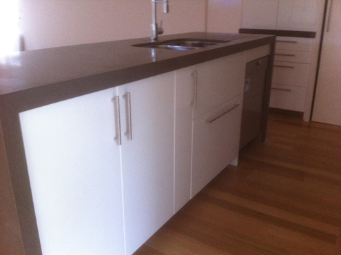 This kitchen has vinyl wrap doors and panels, caesarstone benchtops appliance cupboards and walk in pantry. The main benchtop has waterfall ends, undermount sink and dish drain grooves. Back to Kitchen Gallery