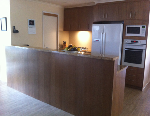 Kitchen made from American Oak rift cut veneer. The veener cut was selected for it's uniform grain pattern. The granite benchtops give a very personal feel to this kitchen and the piece of stone was specifically selected. The kitchen also incorporates a concealed rangehood and glass splashbacks with a pearlescent finish. The veneer has been finished in a custom stain and 30% 2 pack satin lacquer.
